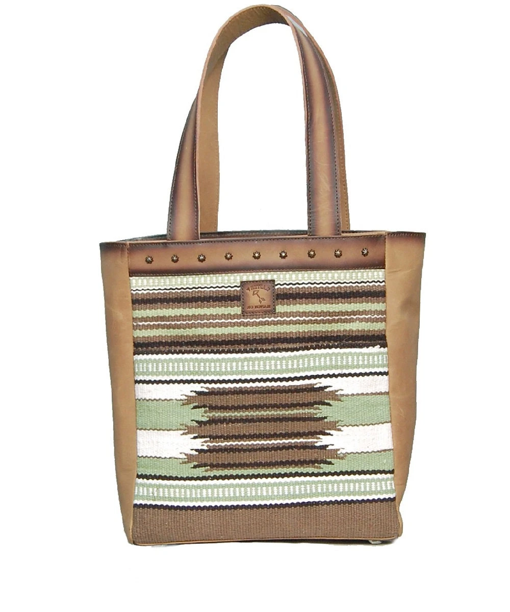 Sand Leather Construction; Brass Closures; Measures Approximately: 11″ W X 14″ H And 6″ Gusset; Color: Sand Brown And Navajo Green And White; Style #BL8474