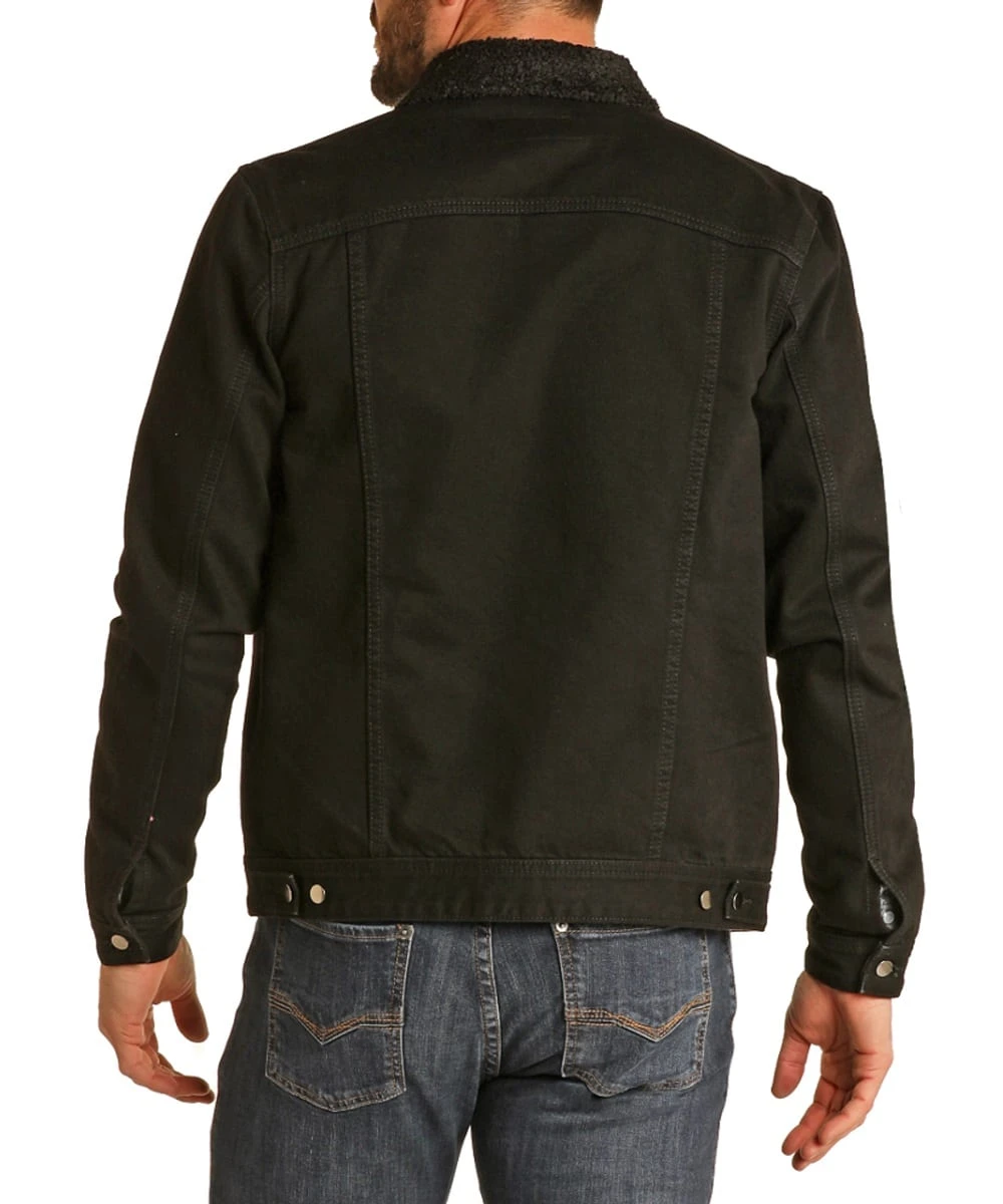 100% Cotton; Long Sleeve Denim Jacket; Sherpa Collared Neckline; Full Button Closure And Cuffs; Two Single Point Button Flap Chest Pockets; Two Hand Pockets; Color: Black; Style #RRMD92R0N6