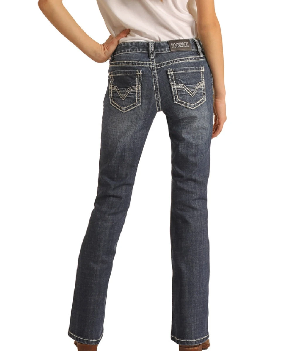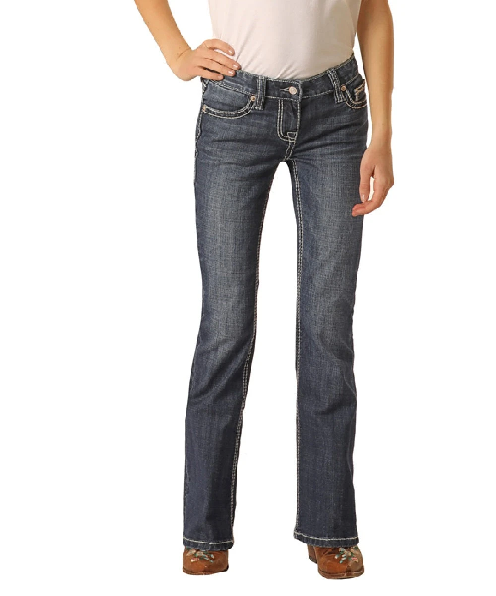 98% Cotton/2% Spandex; Medium Vintage Wash; Whiskers; Sanding; Five Pocket Styling; Fashion Back Pocket; Boot Cut; Style #G5-2721