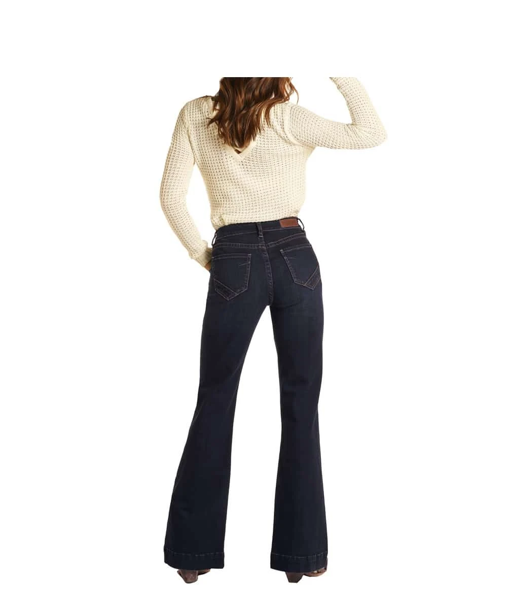 98% Cotton/2% Spandex; Dark Wash; Whiskering; High Rise; Four Pocket Styling; Five Button Fly Closure; Trouser Jean; Style #W8H1663