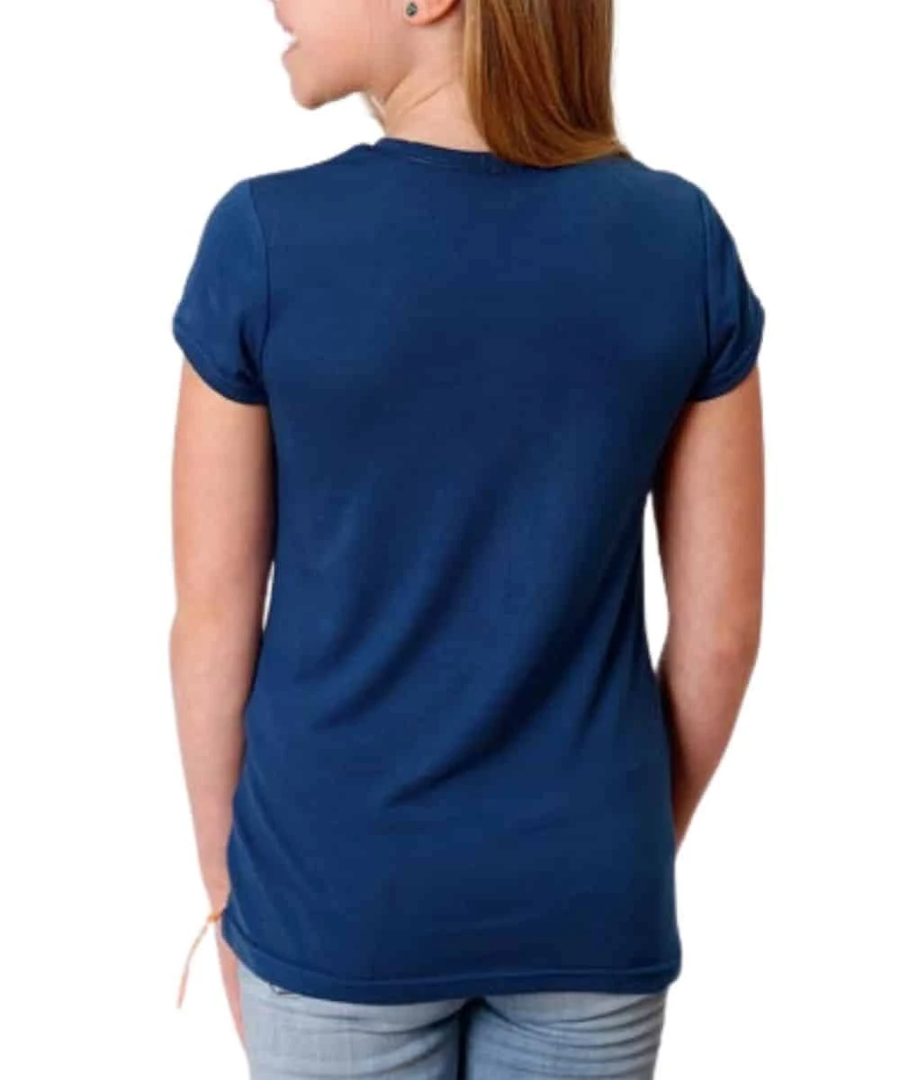 65% Polyester/35% Rayon; Jersey Knit Short Sleeve Tee; Scoop Neck; Screen Print Reads “Free Spirit”; Color; Navy; Style #03-009-0513-2043