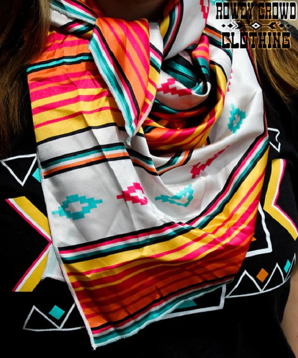 100% Polyester; Orange, Red, Yellow, White, Green And Turquoise Serape Southwestern Print; Measures Approximately: 36″ X 36″; Style #SOMERSET SERAPE WR