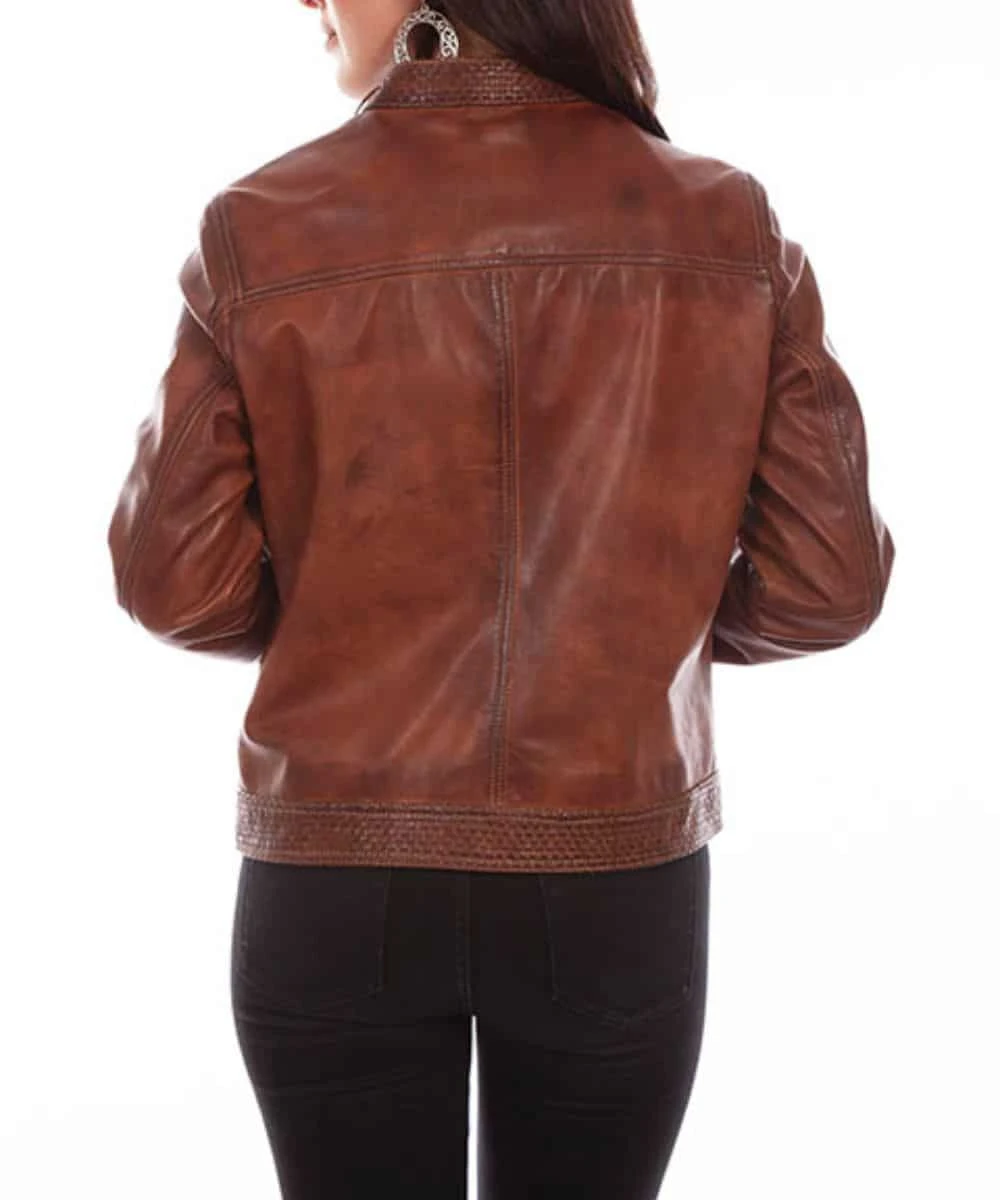 Washed Lamb Leather; 100% Cotton Print Interior Lining; Slim Fit; Long Sleeve Jacket; Zip Front Closure; Checker Board Weave Band Collar And Waistband; Two Hand Pockets; Color: Antique Brown; Style #L1061