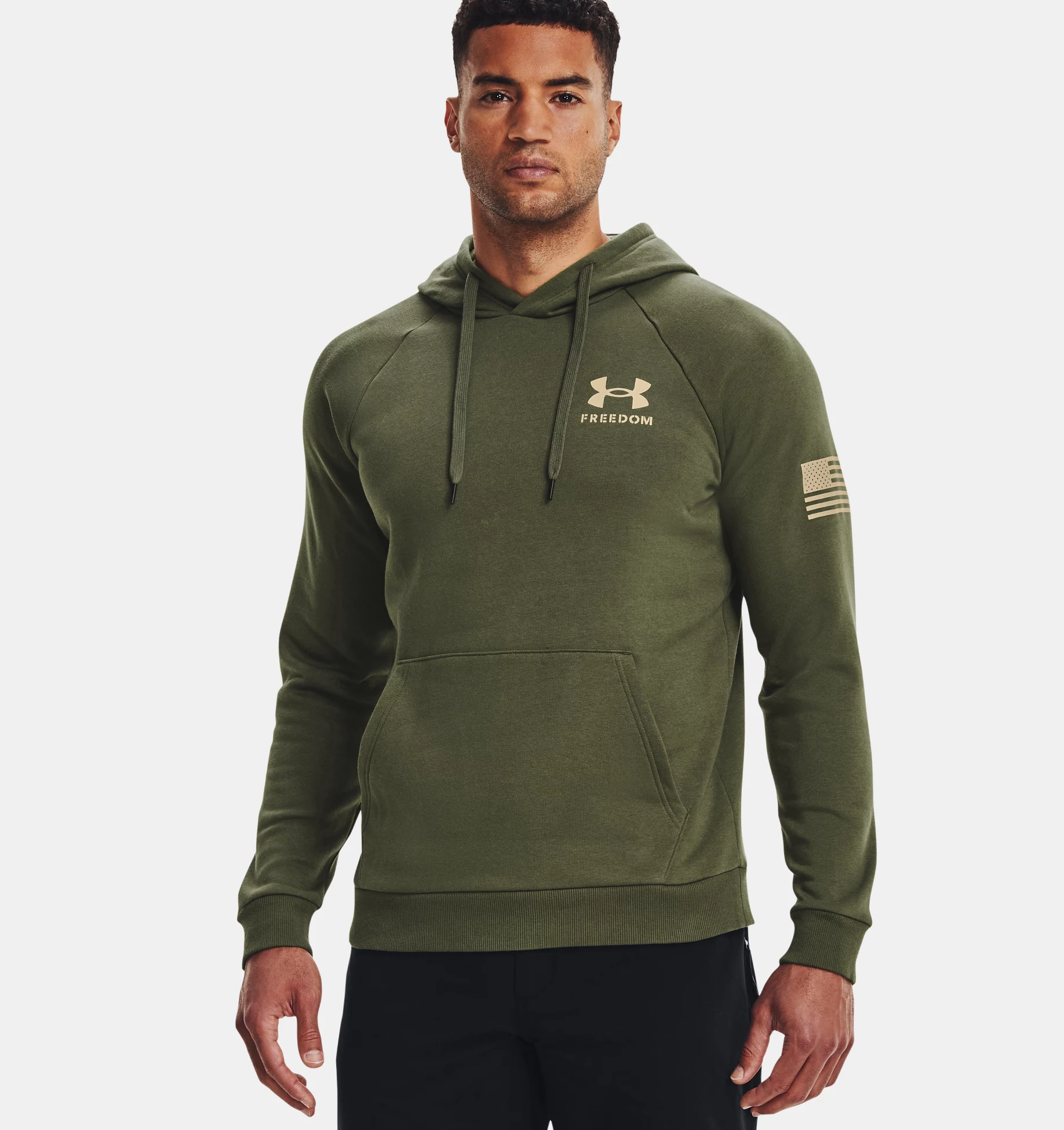 80% Cotton/20% Polyester; Color: Marine OD Green/Desert Sand; Drawstring Hood; Raglan Sleeves; Under Armour Freedom Logo Graphic On Left Chest; American Flag Graphic On Upper Left Arm; Front Kangaroo Pocket; Ribbed Cuffs And Buttom Hem; Under Armour Freedom Logo And Flag Graphic On Back; Soft Mid-Weight Performance Cotton Construction With Brushed Interior For Extra Warmth; Fuller Cut For Looser Fit And Complete Comfort; Style #1370806-390