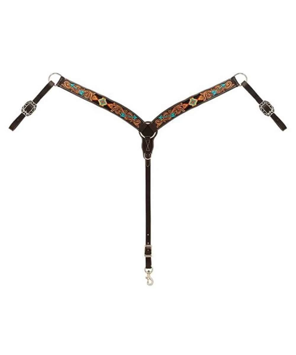 Dark Oiled Leather; Carved Design; Turquoise Hand Painted Arrows; Beaded Inlay; Genuine Cowhide; Non-Rust Stainless Steel Hardware; Designer Buckles; Breast Pieces Taper From 1-3/4″; Style #45100-01-30