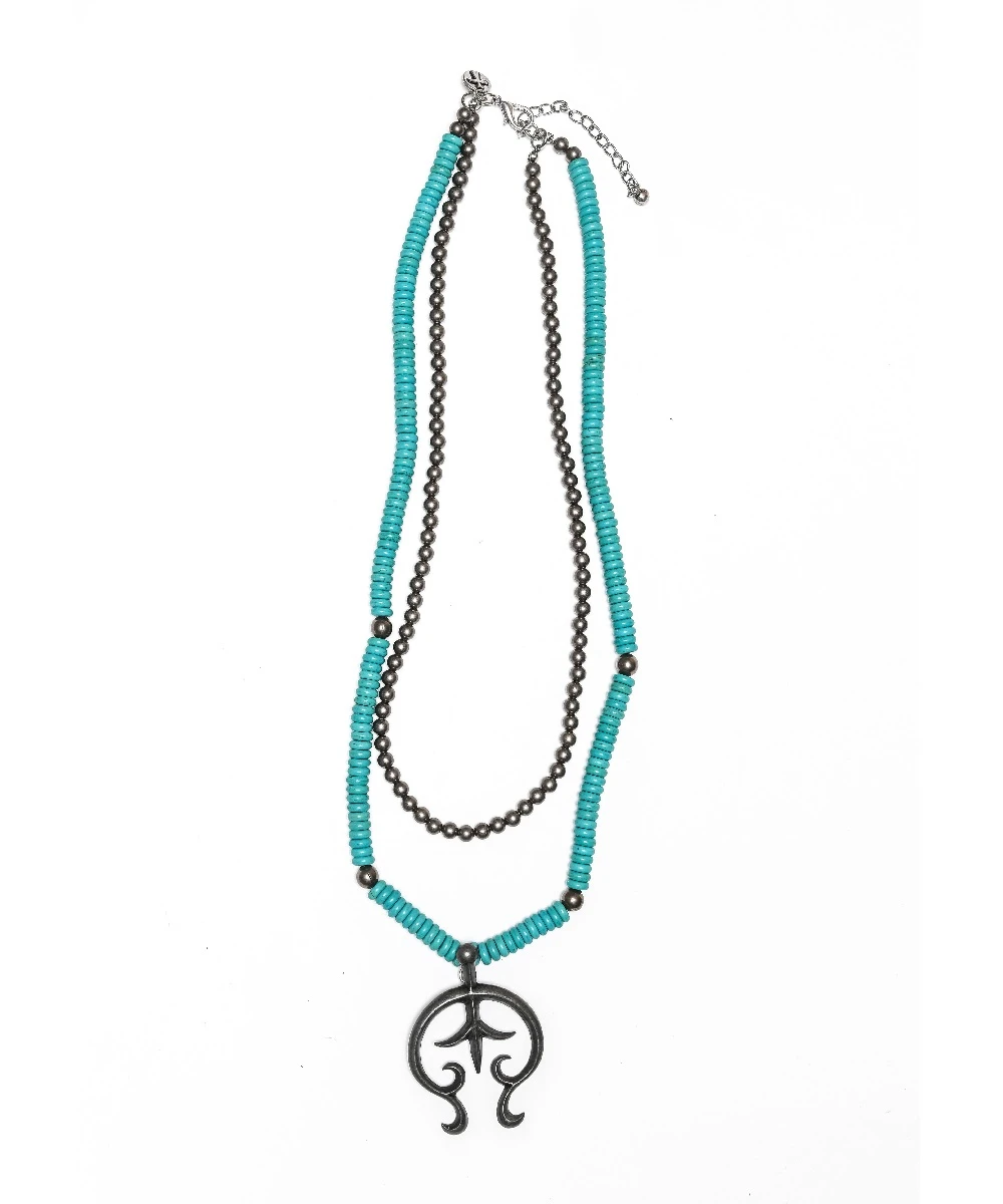 Turquoise And Pewter Beads; Burnished Silver Naja Pendant; Two Strands; Style #N562