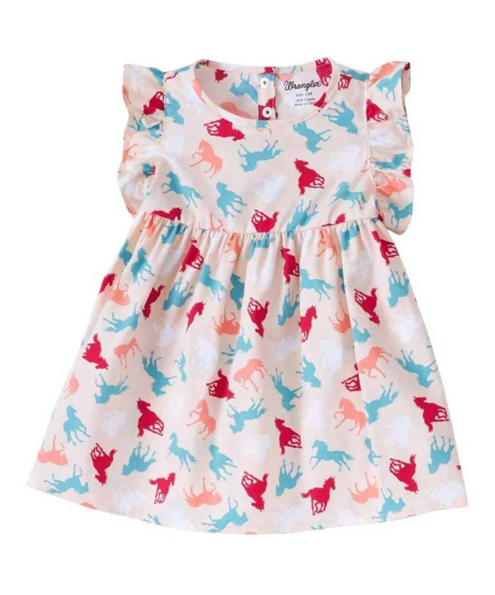 100% Cotton Poplin; Short Sleeve Dress; Ruffled Sleeves; Three-Snap Back Closure; Color: Peach With Multi Color Wild Horses Print; Style #112315097