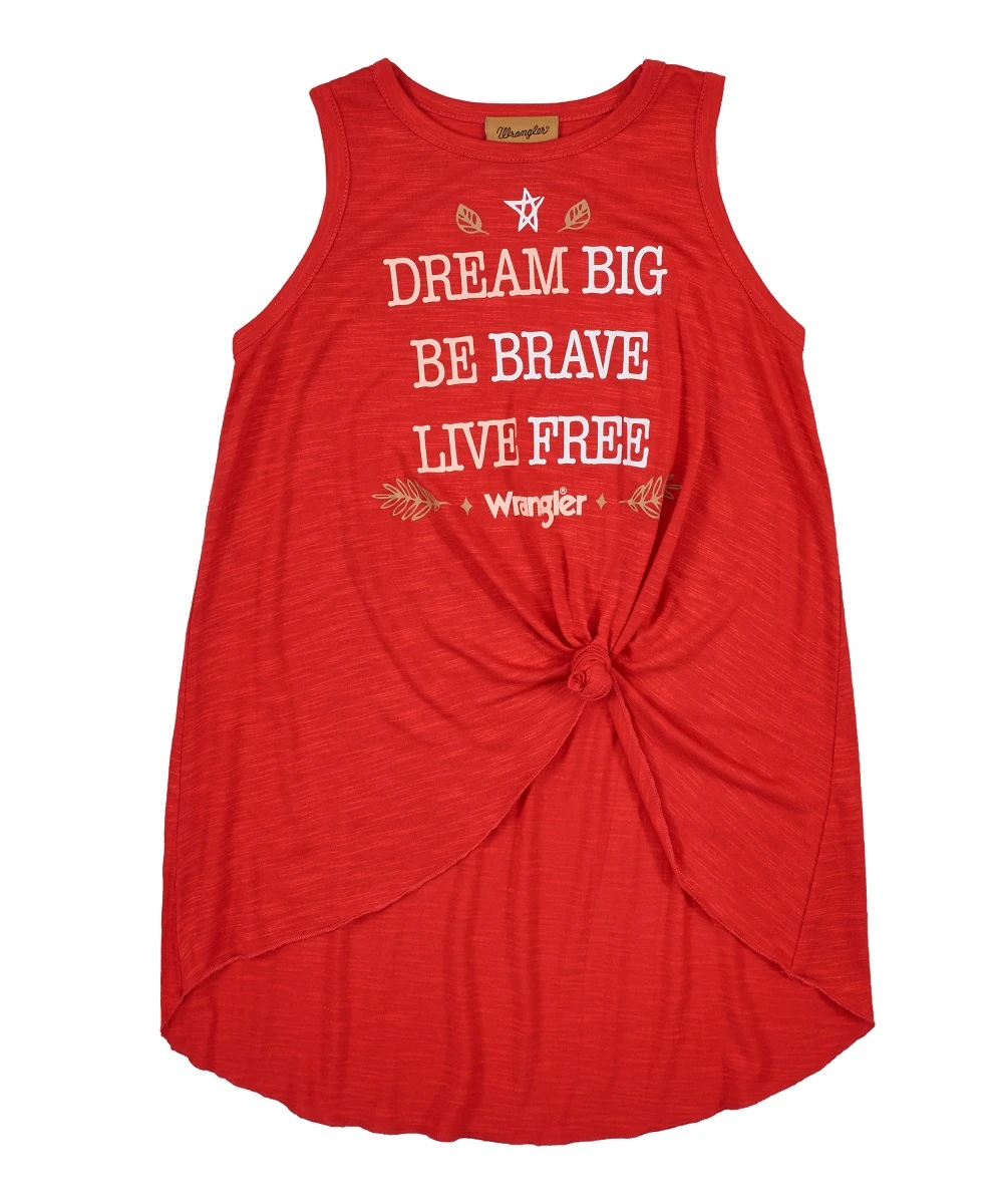 50% Polyester/50% Rayon; Knotted Front Accent; Front Print Reads: Dream Big, Be Brave, Live Free; Style #GWK203R