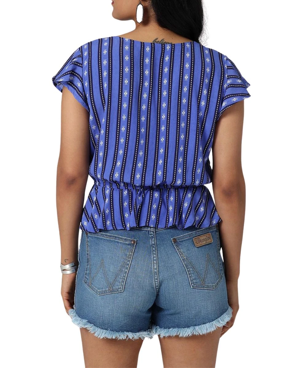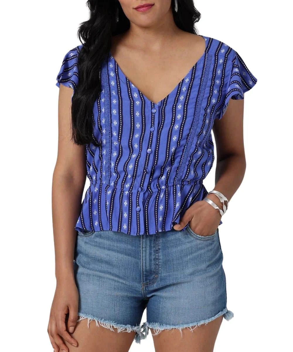 100% Rayon Crinkle; Regular Fit; Short Sleeve; Button Front Placket; V-Neckline; Flutter Sleeves; Gathered Waistline; Peplum Silhouette; Color: Blue; Style #112329850