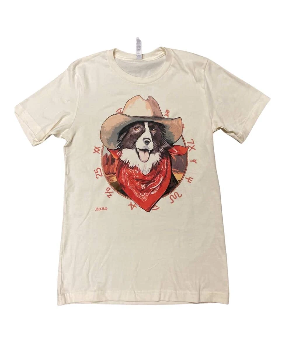 100% Cotton; Color: Cream; Design Is A Border Collie In A Hat And Bandana With Branding Symbols Around It; Crew Neck; Short Sleeves; Style #BORDER COLLIE